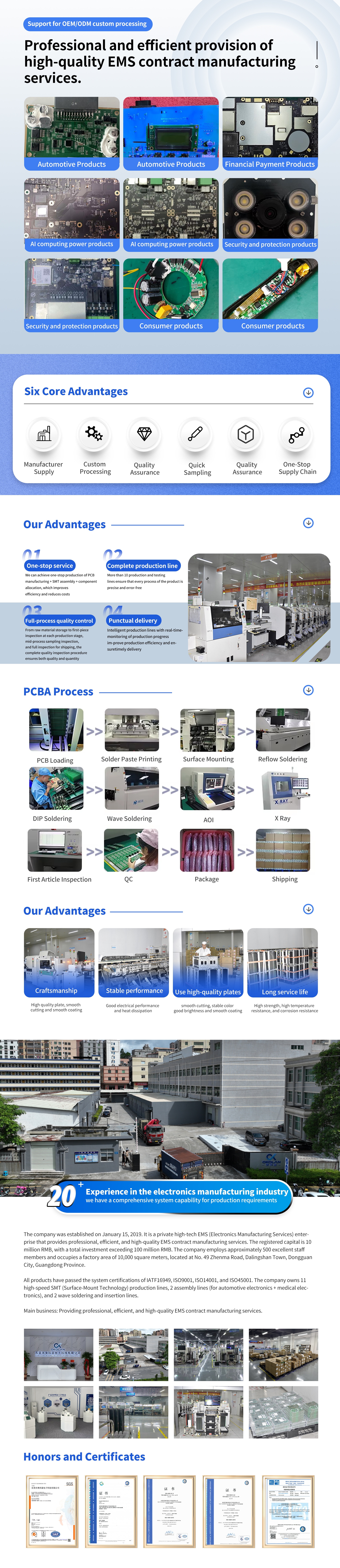 All products have been certified by IATF16949, ISO13485, ISO9001, ISO14001, ISO45001 and other systems. We have 11 high-speed SMT production lines, 2 assembly lines (automotive electronics+medical electronics), and 2 peak plug-in cables. Main busines